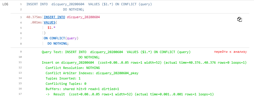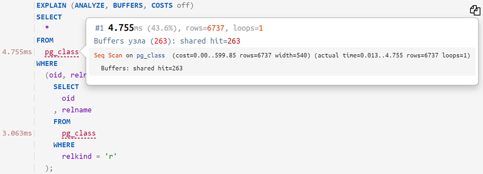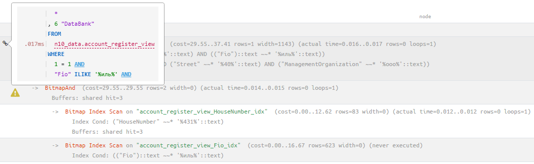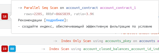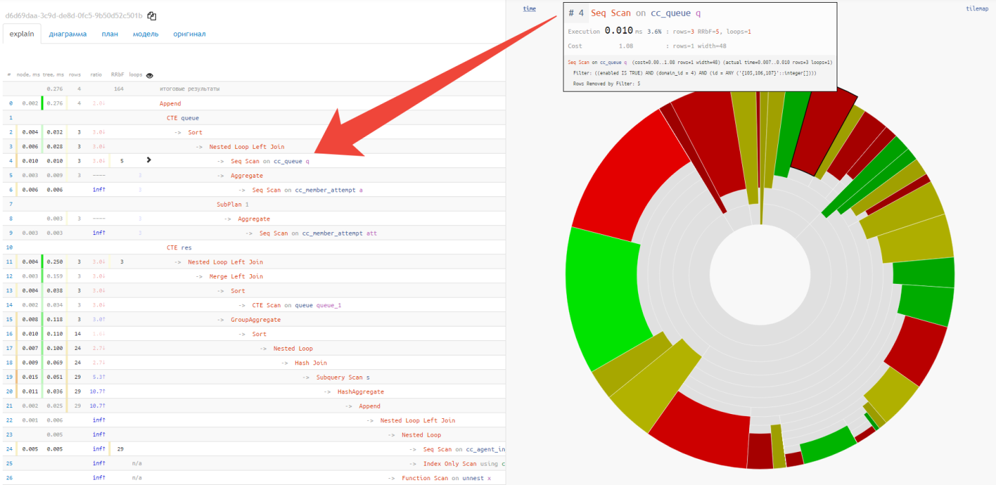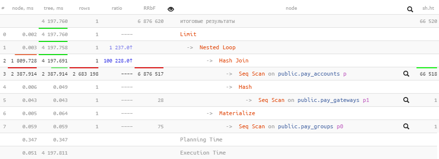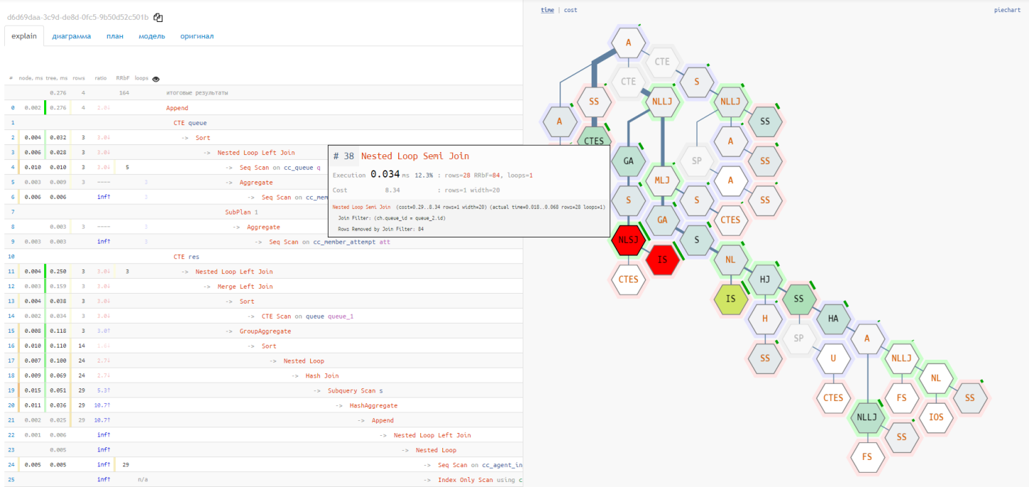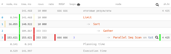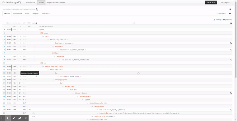 Summary statistics of nodes allows you to analyze plans of tens of thousands of rows in aggregated form sorted by any indicator: execution time or read from disk, the amount of data received from the cache, or the number of filtered rows.