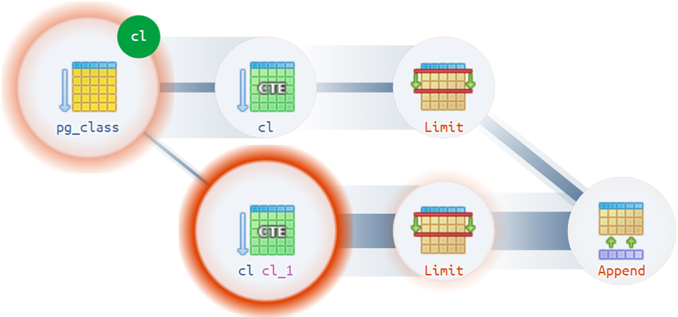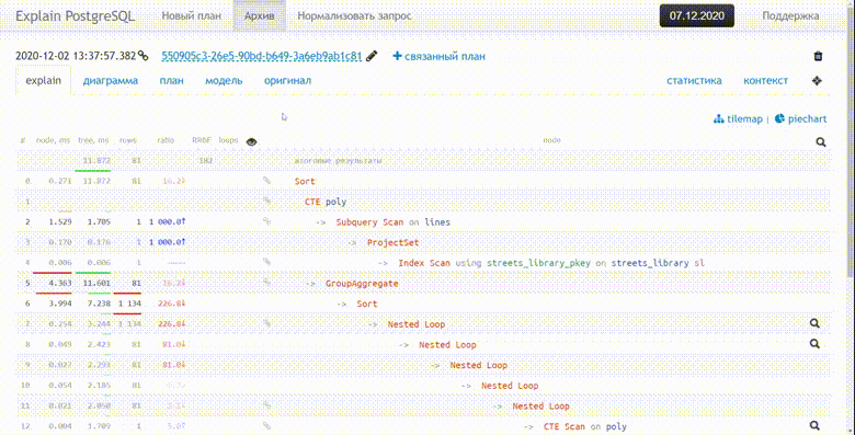 Tiled visualization allows you to compactly evaluate the connection of nodes in large plans and highlight the section of the query where the problem has arisen.